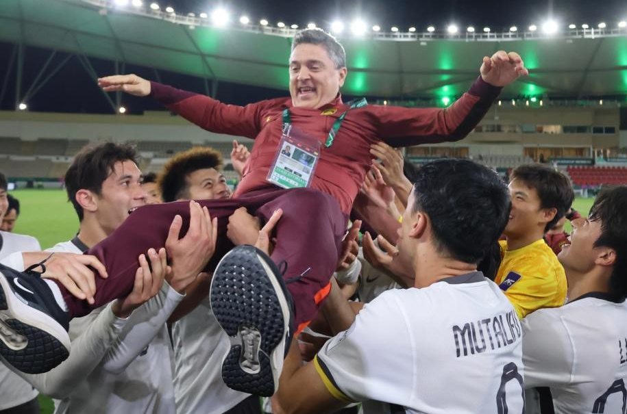 安东尼奥与弟子们一同庆祝胜利。新华社发